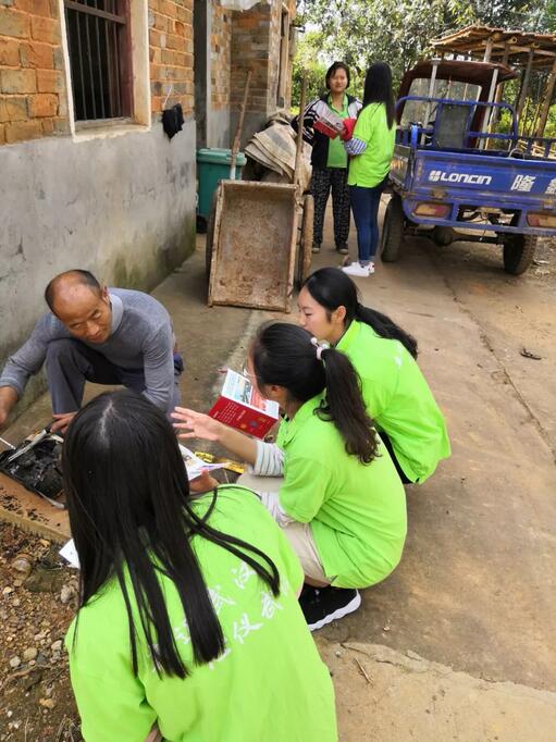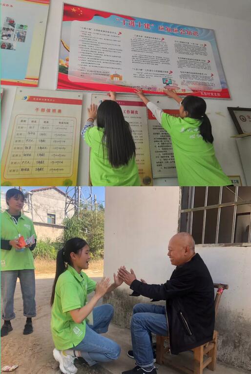 到了村委会,袁老师对今天的下乡任务进行了分配,主要是完成“十进十建”和“军运会”相关知识的宣传。面对生动有趣的军运会宣传册和严肃的“十进十建”宣传栏,所有人都十分投入的学习和观摩。在学姐李明明的带领下,大家都熟悉了军运会拍手歌:“你拍一,你拍一,我拍一,十月金秋迎接军运;你拍二,我拍二,吉祥萌物叫兵兵;你拍三,我拍三,世界军民齐汇聚;你拍四,我拍四,文明竞技传友谊;你拍五,我拍五,观赛礼仪需谨记;你拍六,我拍六,江城武汉欢迎您”。旨在通过脍炙人口的拍手歌,在有趣互动中,将军运会知识传输给村民,武汉作为第七届军人运动会的东道主,每一个武汉人民理应熟知相关内容。